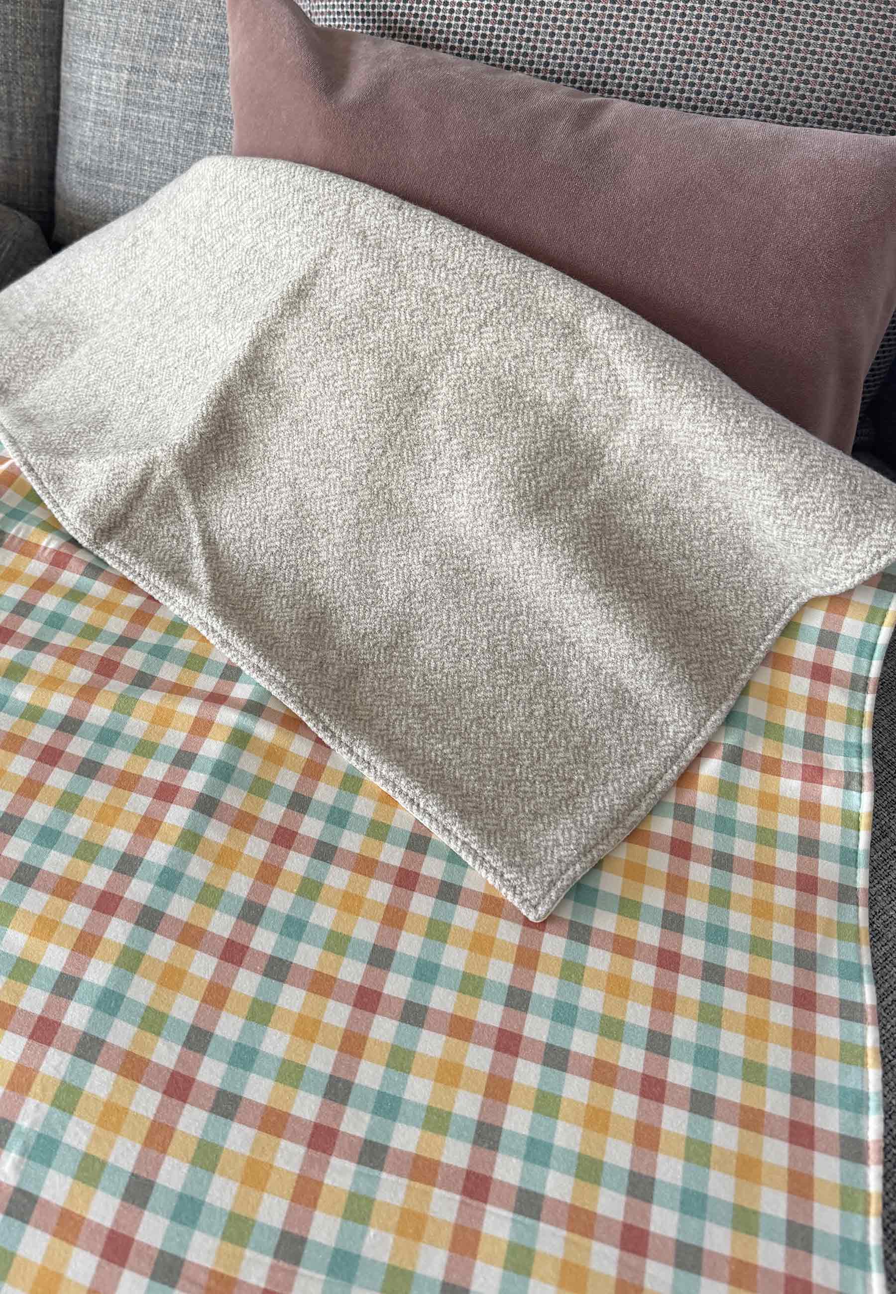 Nello specifico, per questa copertina, puoi scegliere tra la fantasia Magia del Natale o Pinguini per un lato e dall'altro avrai un tessuto jacquard generato da una mischia intima di lana merino, canapa GOTS, yak e lana italiana. Un tessuto straordinario morbido e leggero, caldo e avvolgente con un'eccellente protezione termica.